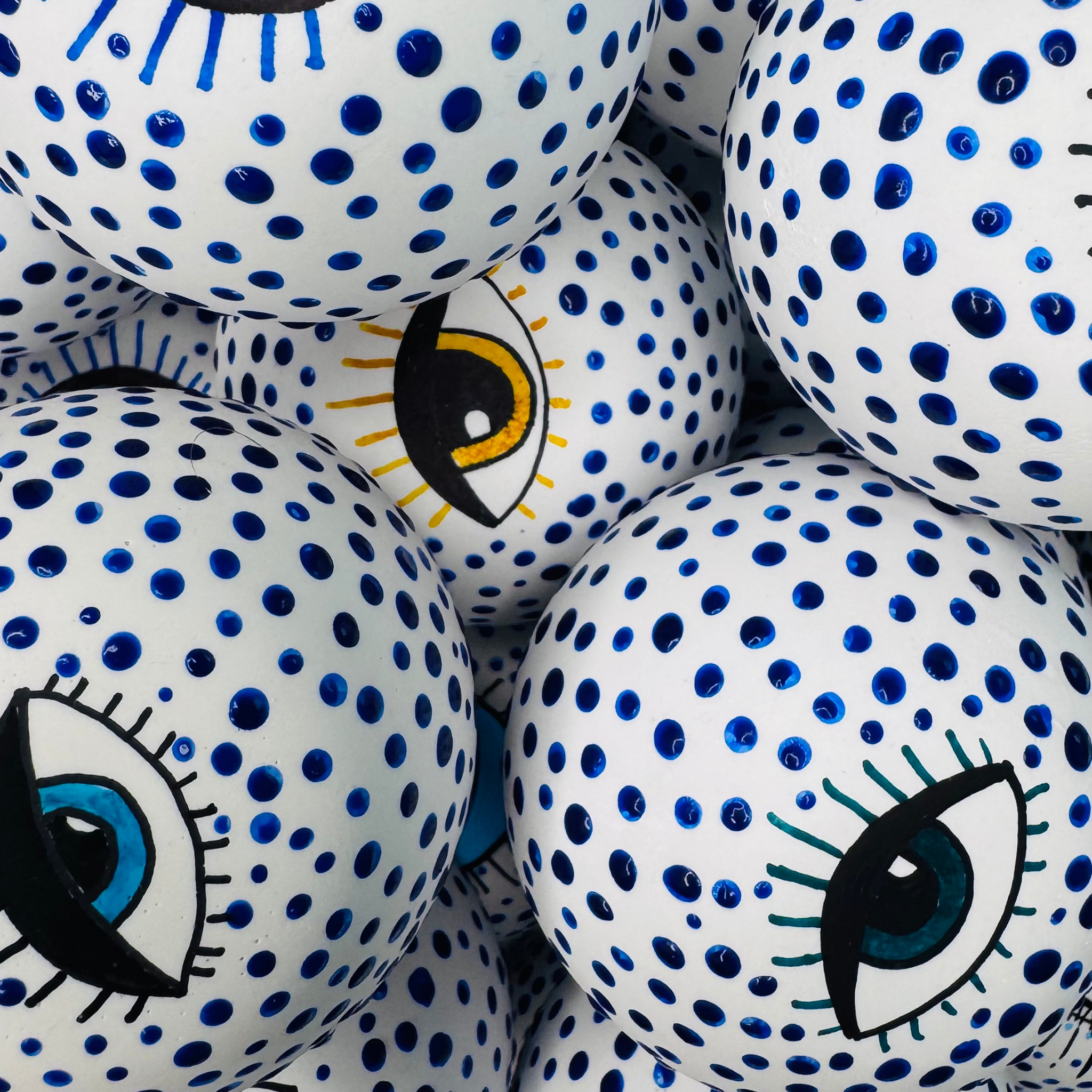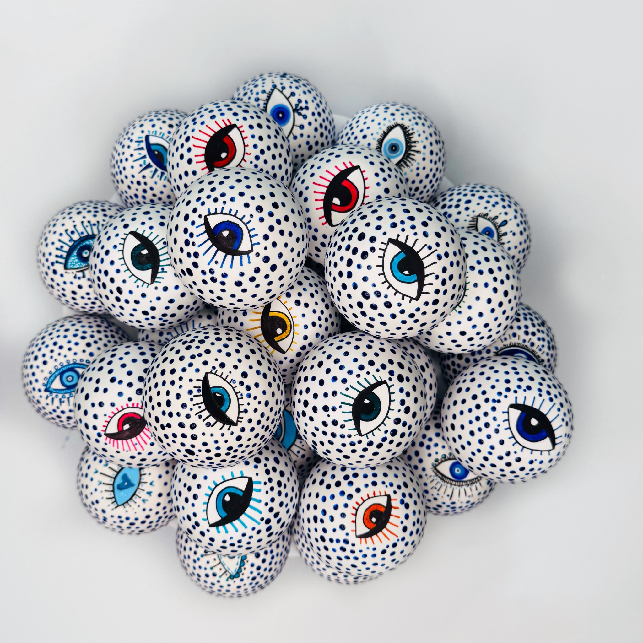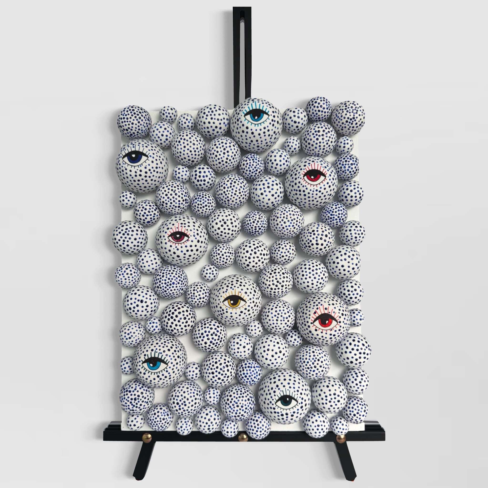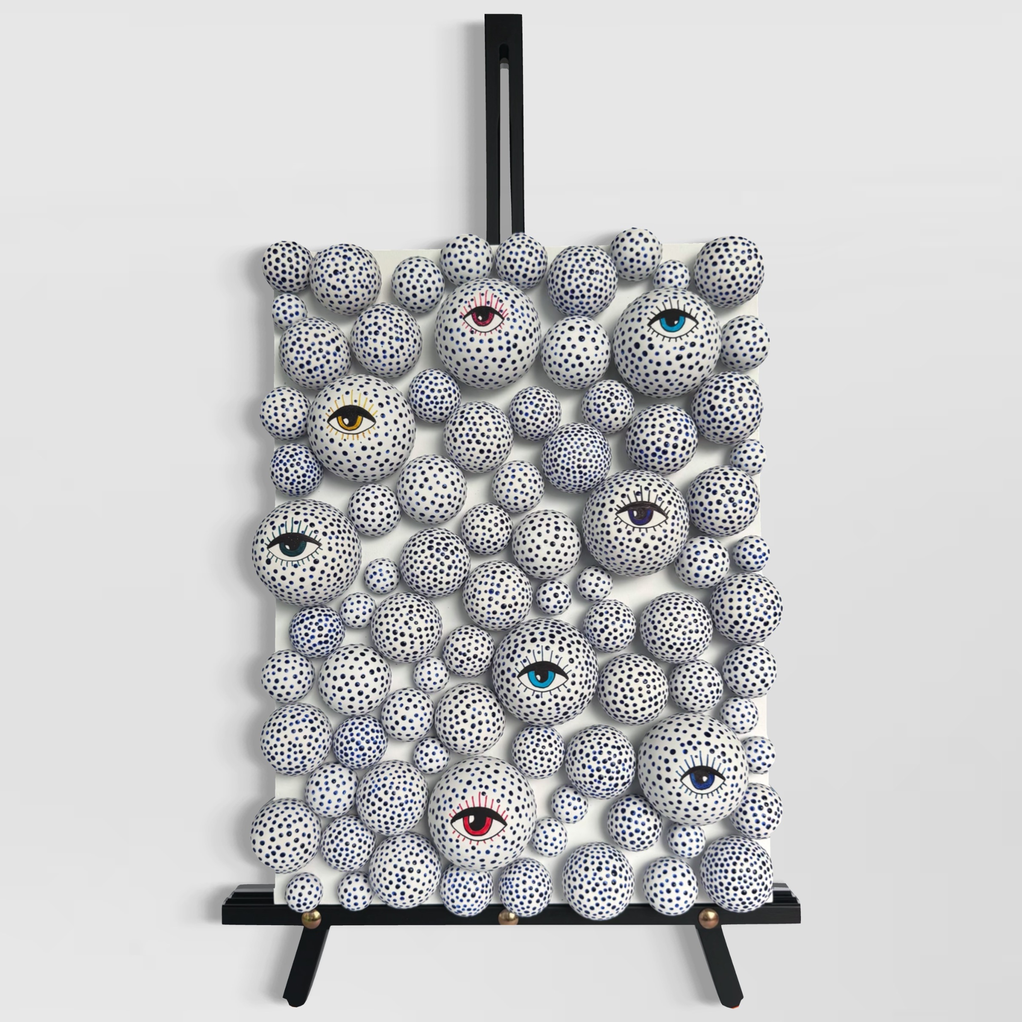 Clusters of hand-formed spheres create a rhythmic sculptural surface where dotted patterns suggest endless points of vision. Among them, painted eyes appear—quiet, watchful, and expressive.